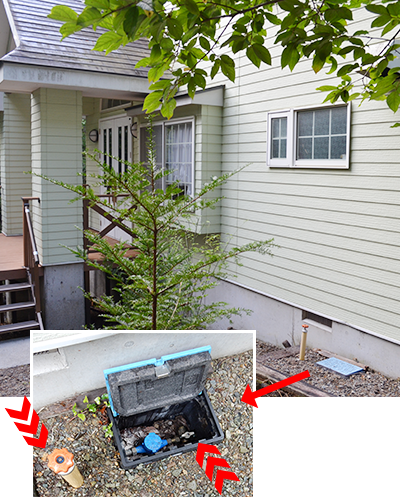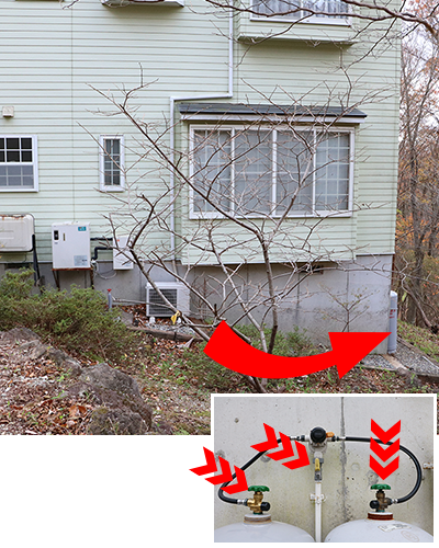 プロパンガスタンク×2 本、引き込みパイプ、3 箇所開栓してさい